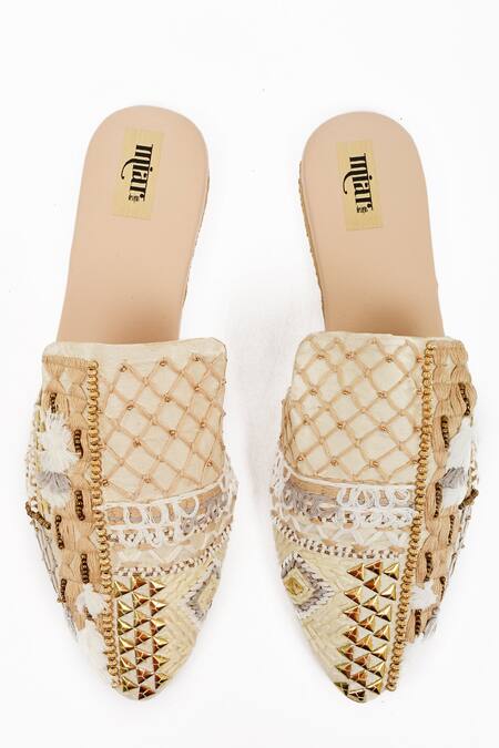 Ivory faux leather mules featuring a closed shoe pattern with geometric design