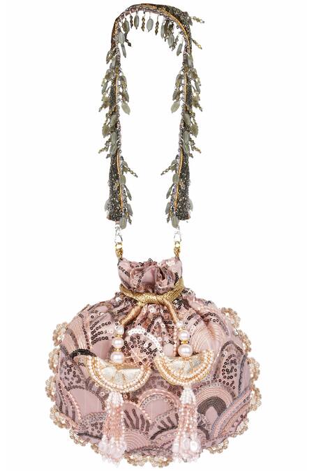 Pink potli bag featuring hand embroidery with sequins and rhinestones