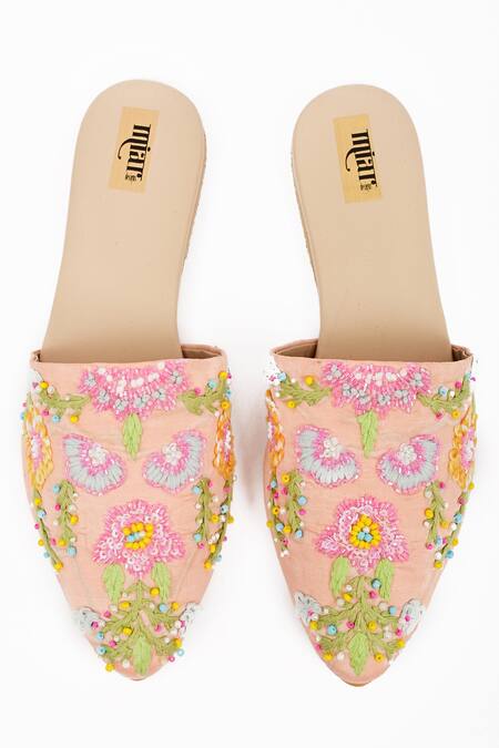 Peach mules featuring floral embroidery with thread and beads
