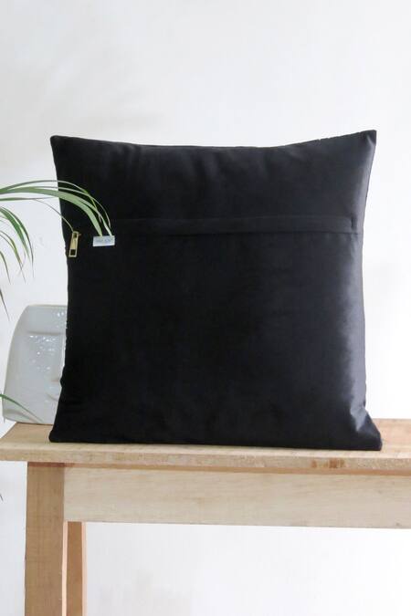 Black set of 2 square shaped cushion covers with abstract patchwork embroidery and thread embroidery.