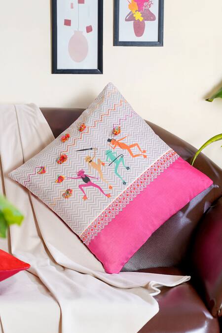 Multi color set of 2 cushion covers with dancing frogs, chevron print and embroidery detailing.
