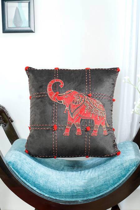 Black, red 2 pcs square shaped cushion cover with zardozi, bead embroidery in elephant pattern.