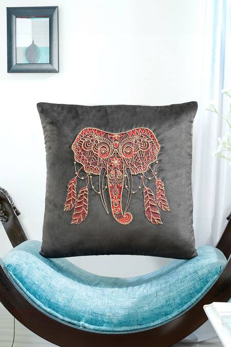 Black Velvet Bead, Zardozi Elephant Face Embroidered Cushion Cover 2 Pcs Set