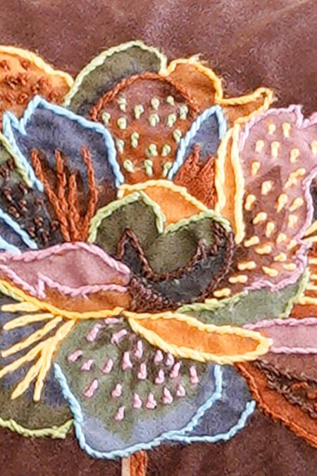 Brown cushion cover with contrast floral hand embroidery using beads and cutdana work.