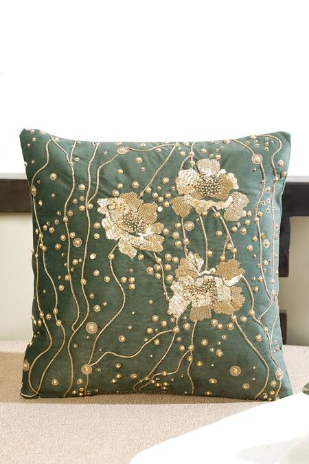 Green 4 pcs square shaped cushion cover with bead, cutdana, sequin embroidery. Comes with 1 pc rectangle shaped embroidered cushion cover.