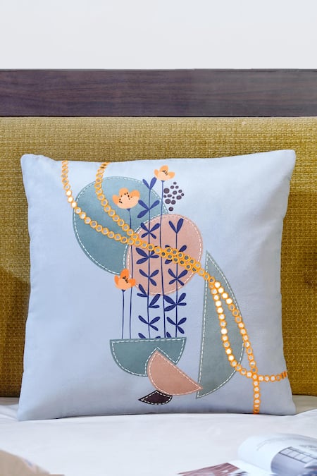 Pastel blue 5 pcs cushion cover with tropical print & mirror, stitchline thread embroidery.