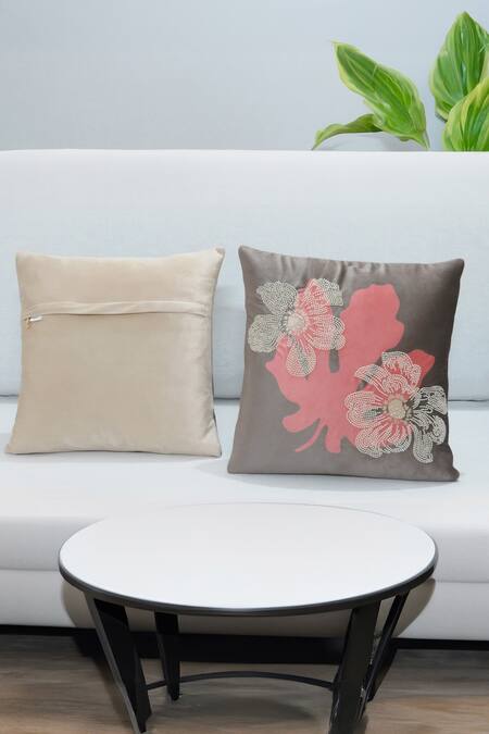 Grey square shaped set of 2 cushion covers with floral prints and beaded hand embroidery.