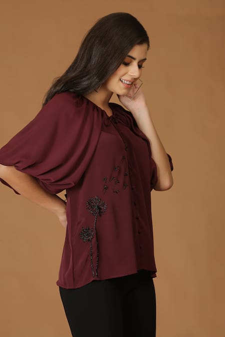 Buy_Midori By Sgv_Maroon Embroidered Cutdana Drawstring Balloon Sleeve Top  _at_Aza_Fashions