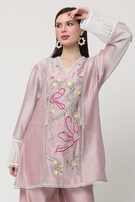 Pink kurta featuring floral thread embroidery embellished with pearls and scalloped lace. Paired with matching pants in a relaxed fit.