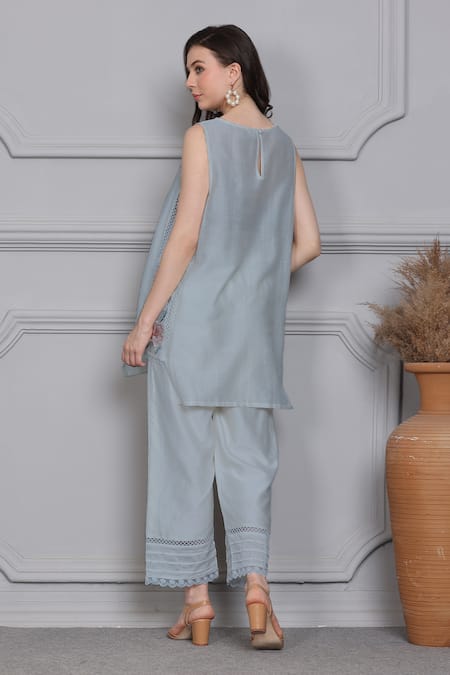 Blue kurta featuring floral thread embroidered cutwork panel embellished with sequins and pearls. Paired with matching pant that has intricate lace detailing.