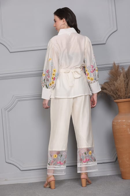 Off white top featuring floral embroidery on the sleeves and a V neck. Paired with matching pants that have a floral embroidered organza panel and a coordinating belt.
