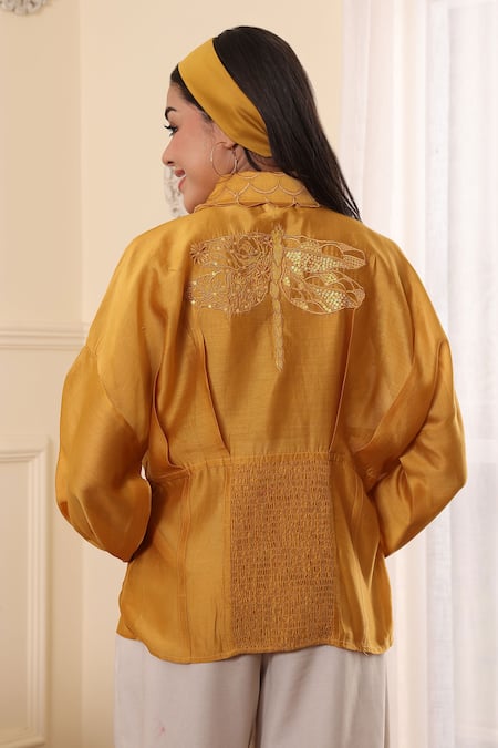 Mustard collared shirt featuring delicate pleats, double placket, and intricate cutdana and sequin embellishments
