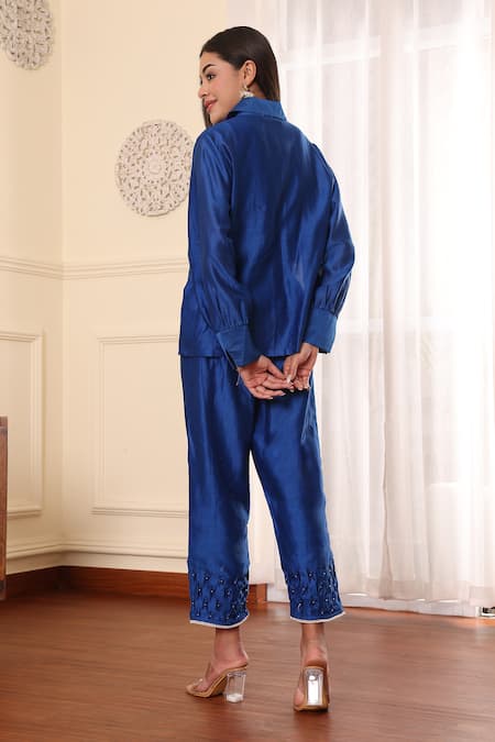 Blue Chanderi Silk Sequins Collared Organza Patchwork Royal Shirt