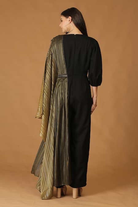 Black and olive pleated jumpsuit in imported crepe with a draped detail on one side