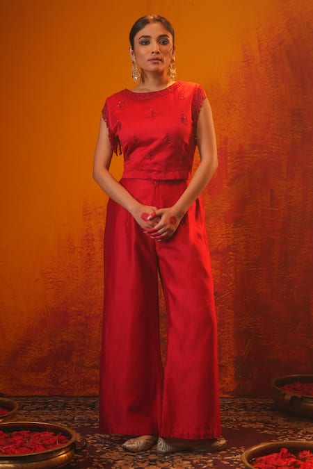 Red silk chanderi crop top with cutdana, chir, crystals and sequins embroidery. Paired with wide-leg pants featuring a relaxed fit.