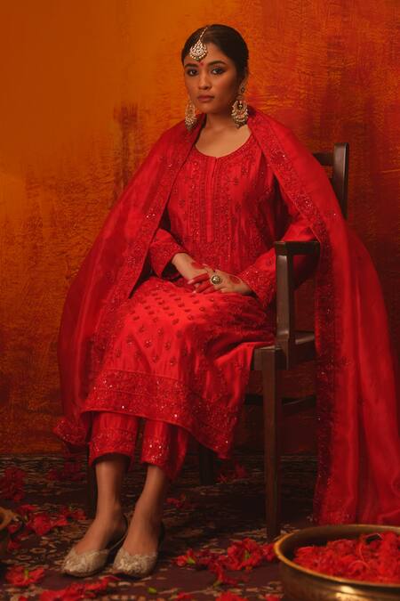 Red Silk, Organza, Cotton, Chanderi Cut Work, Cutdana Embroidered Kurta Pant Set
