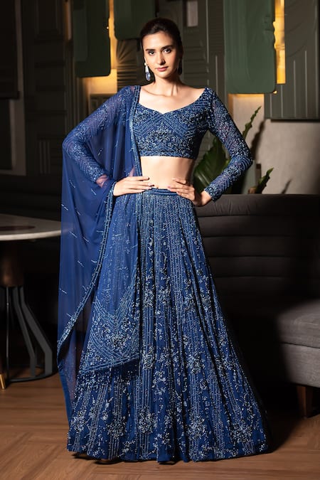 Navy blue lehenga featuring embroidered cutdana and sequin work with geometric and floral patterns. Paired with a matching padded blouse and dupatta.