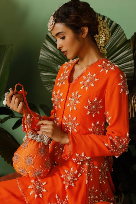 Buy_Midushi Bajoria_Orange Georgette Cut Work, Sequins, Pearls Hand Embellished Peplum Kurta Set _at_Aza_Fashions