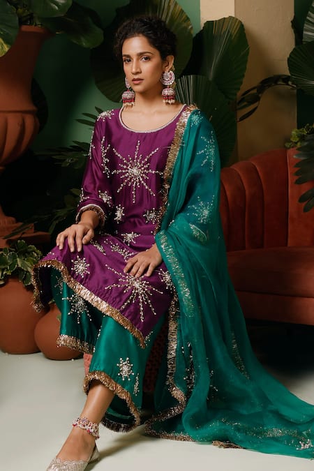 Midnight purple silk chanderi kurta featuring a hand embellished star pattern with pearls, cutdana, and stones. Paired with forest green pant and an organza dupatta.
