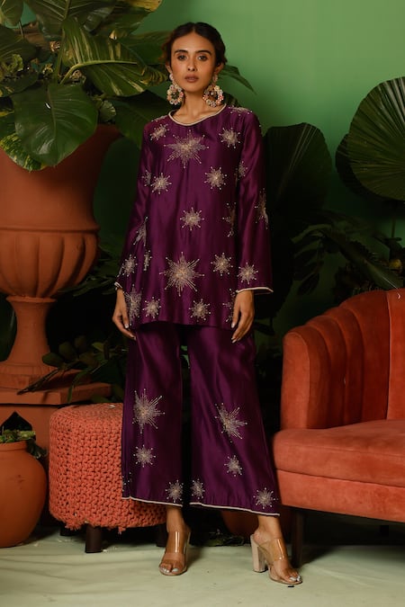 Midnight purple silk chanderi kurta featuring a hand embellished star pattern with kasab, stones, and pearls. Paired with matching pant and an organza dupatta.