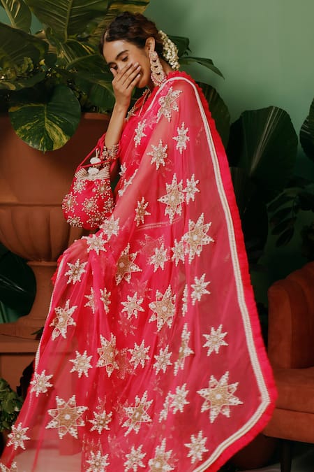 Candy pink saree crafted from organza featuring a pleated border and embellished with pearl, cutdana, stone, and floral patterns. Accompanied by a sleeveless georgette blouse and a shantoon lining petticoat.