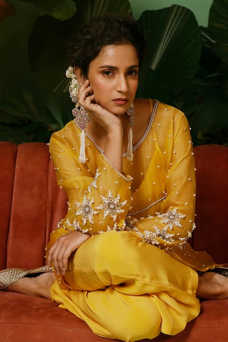 Yellow sheer top featuring pearl, cutdana, stone, and floral embroidery. Paired with a matching crepe pant and shantoon slip.