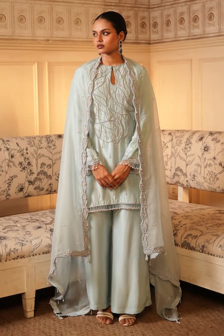 Buy_Midushi Bajoria_Blue Organza, Silk Pearls, Embroidery Work Embellished Short Kurta Sharara Set