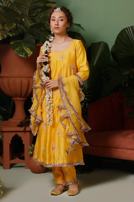 Buy_Midushi Bajoria_Yellow Silk, Chanderi, Organza Pearls, Stones, Kurta Set With Ruffle Dupatta _Online_at_Aza_Fashions