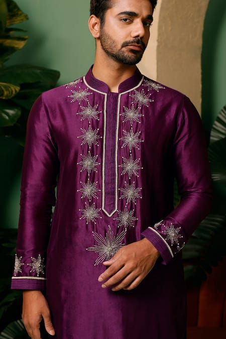 Midnight purple silk chanderi kurta featuring pearl embellished, star embroidered motifs. Paired with a matching churidar.
