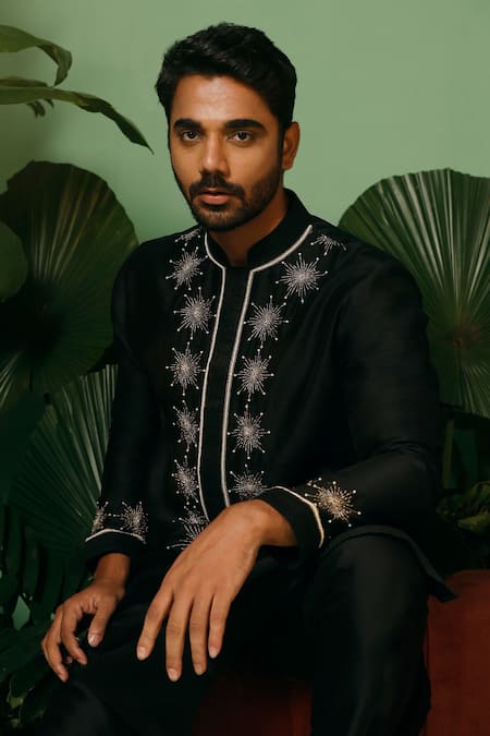 Black silk chanderi kurta featuring pearl embellished star burst embroidery. Paired with matching pant in a straight silhouette with attached lining.