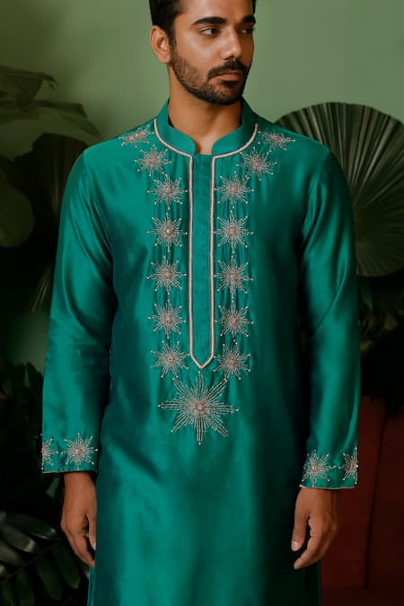 Green kurta featuring star embroidered motifs with pearl, sequin, and cutdana work. Paired with matching pants, both crafted from silk chanderi with cotton lining.