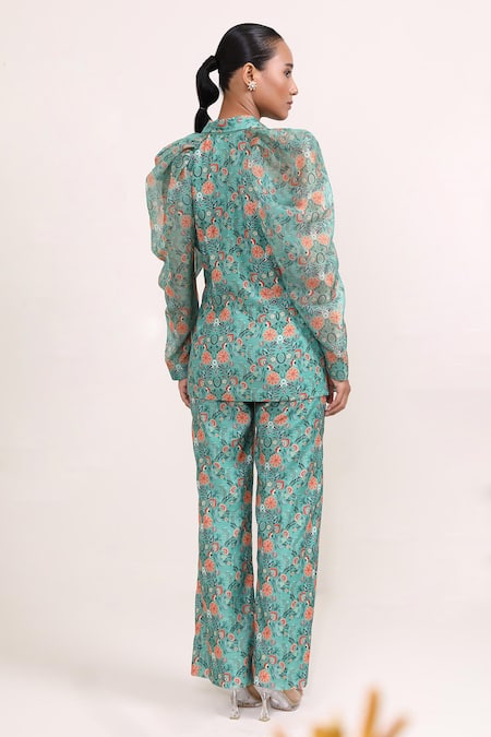 Green floral printed jacket featuring puffed sleeves and a V neck. Paired with a matching printed sharara.