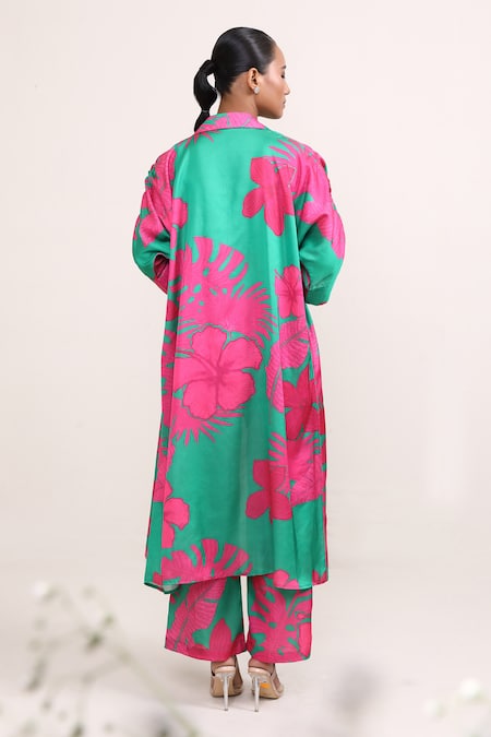 Green and pink floral printed cape featuring an open neckline and gathered hem. Paired with a sweetheart neck bustier and flared pant.
