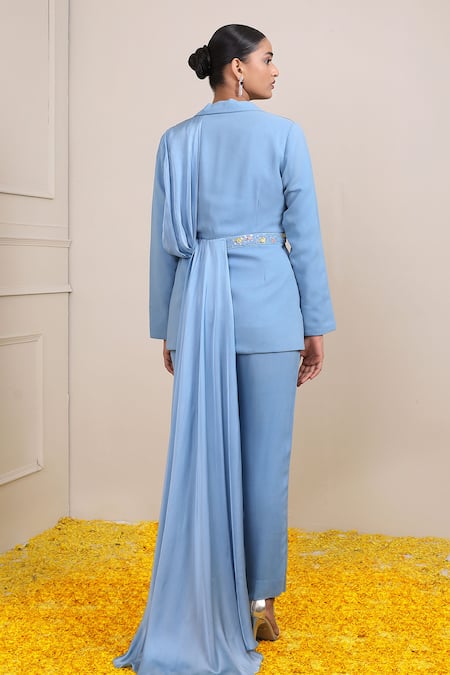 Blue jacket featuring cutdana, bead, and sequin applique embroidery. Paired with a matching inner and palazzo.
