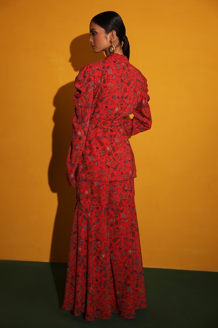 Buy_Miku Kumar_Red Georgette Floral Print Collared Neck Arabella Jacket And Gharara Set_at_Aza_Fashions