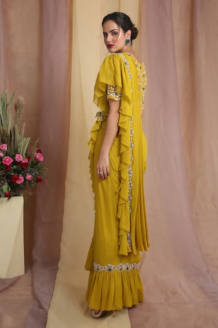 Yellow pre-draped hand embroidered saree with ruffle detailing. Paired with embroidered blouse. Comes with belt & waistbag.