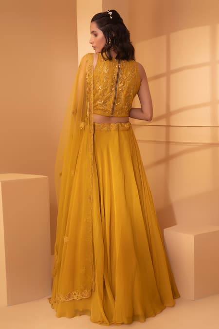 Mustard lehenga with floral motif embroidery. Paired with choli & sheer dupatta.