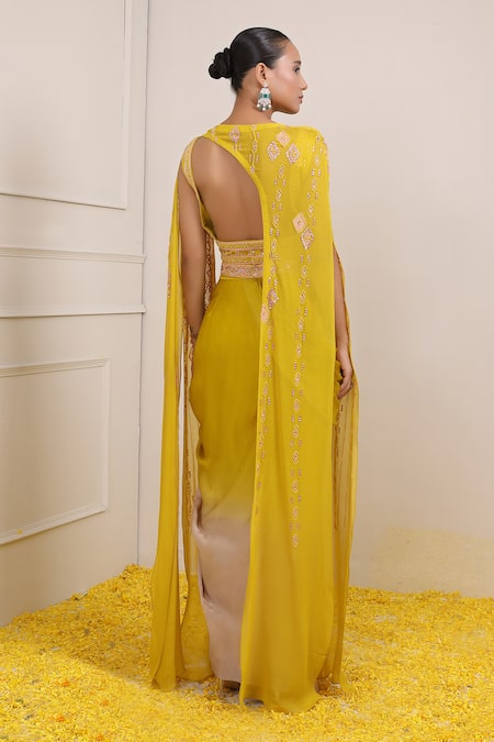 Yellow cape featuring intricate geometric embroidery with sequins, beads, cutdana, and pearls. Paired with a backless angrakha padded choli, dhoti skirt, belt, and bag.