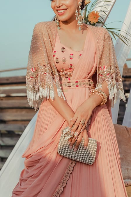 Peach pleated lehenga in georgette base fabric with attached drape in scalloped hem. Paired with embroidered blouse & belt. Comes with a net base cape in zardozi & cutdana embroidery.
