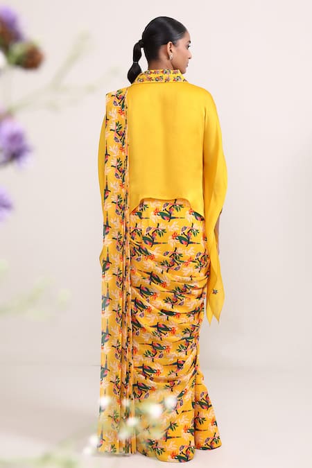 Buy_Miku Kumar_Yellow Georgette, Satin Embroidery Marigold Printed Pre-draped Saree With Cape _Online_at_Aza_Fashions