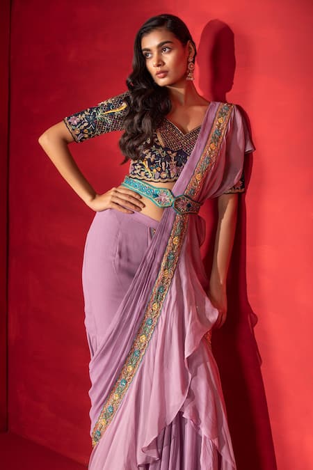 Lilac pre-draped saree with ruffle hem & hand embroidered border. Paired with purple V neck blouse with floral pattern zardozi hand embroidery & blue contrast belt.
