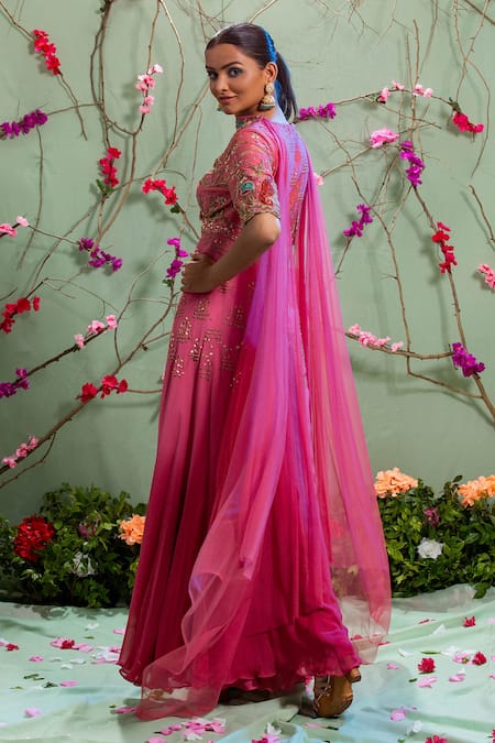 Rose pink front open kurta with zardozi hand embroidery and scalloped hem. Comes with palazzo pants and dupatta.