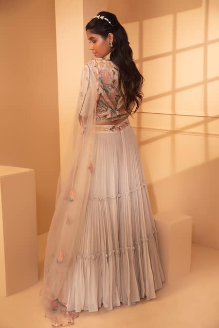 Ivory pleated tiered skirt style lehenga with floral motif hand embroidery. Paired with jacket style choli, sheer dupatta & waistbelt-bag.
