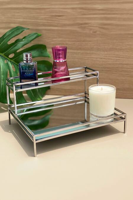 Silver iron framed double decker vanity tray in rectangular shape with mirror base.