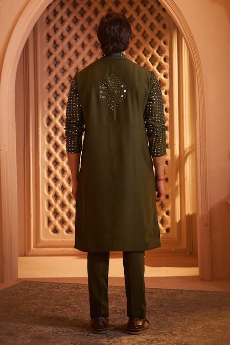A deep green Fire Silk kurta featuring all-over mirror embellishments and fine resham thread embroidery. It is paired with coordinating pyjama bottoms.