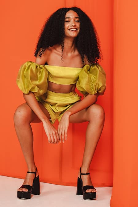 Buy_July Issue_Green Cotton, Organza Square Neck Mim Balloon Sleeve Crop Top With Shorts _at_Aza_Fashions