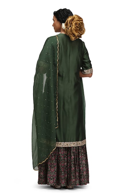 Forest green kurta in munga silk featuring a round neckline and embellished sleeves. Paired with a matching sharara and a contrasting organza silk dupatta.