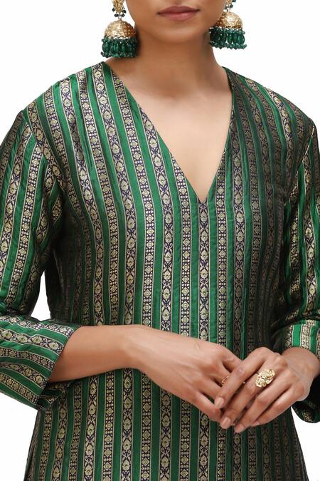 Buy_Mimamsaa_Green Brocade, Silk Piping, Embroidery V-neck Anokhi Patti Work Kurta And Pant Set _at_Aza_Fashions