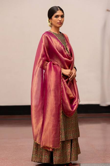Magenta dupatta crafted in tissue silk featuring scallop embroidered border