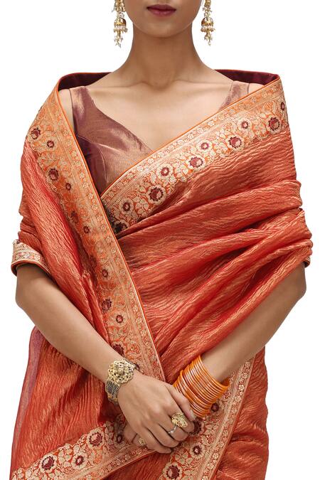 Rust orange saree crafted in crushed tissue featuring sequin & resham embroidered hem